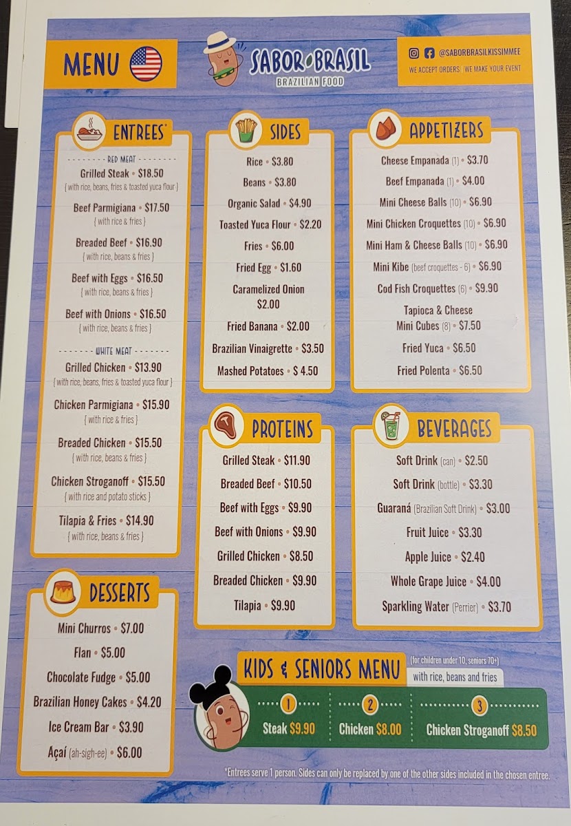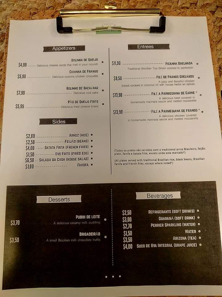 Grilled Picanha Steak, brazilian rice, fresh black beans, toasted yuca flour, choice of fries or steamed fresh vegetables (all fresh and homemade). Picanha grelhada, arroz, feijão, farofa, fritas ou legumes frescos no vapor (tudo fresco e caseiro).