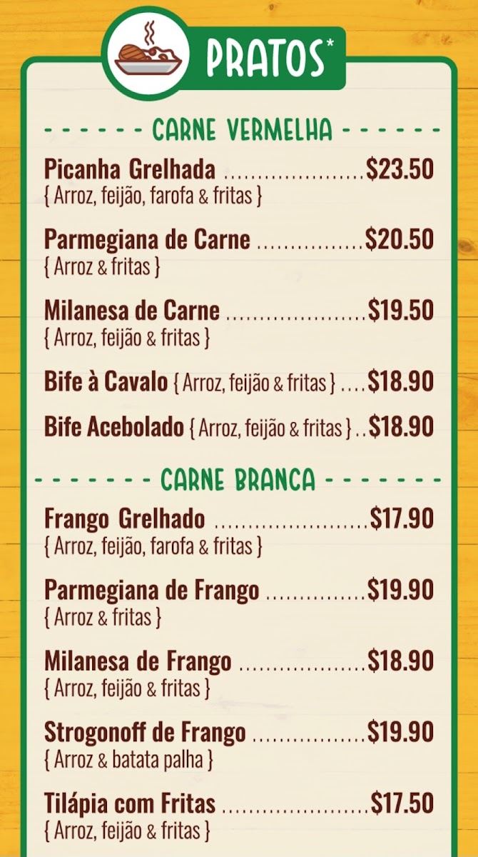 Grilled Picanha (Cut Diced), brazilian rice, fresh black beans, choice of fries or fresh carrots (all fresh and homemade). Cubos de Picanha grelhada, arroz, feijão, fritas ou cenoura ralada (tudo fresco e caseiro).
