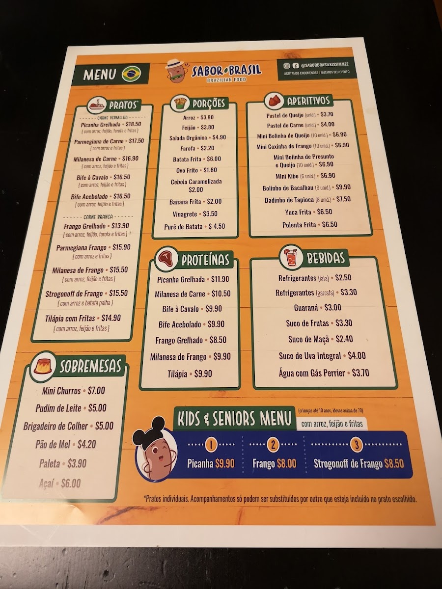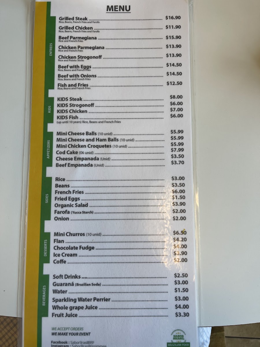 Fried Tilapia, brazilian rice, fresh black beans, choice of fries or steamed fresh vegetables (all fresh and homemade). Filé de Tilapia frita, arroz, feijão, fritas ou legumes frescos no vapor (tudo fresco e caseiro).